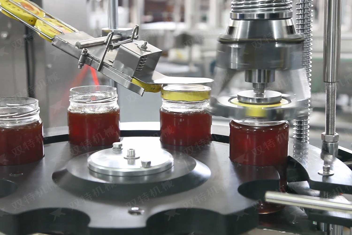 旋蓋機主要用于玻璃廣口瓶的三、四、六鐵蓋真空旋蓋,用兩根不同速度的皮帶壓瓶蓋,因兩根皮帶的速度不同,對蓋進行搓蓋收緊達到旋蓋目的。在自動上蓋之前對瓶口吹蒸汽加熱,吹掉冷空氣,換上高溫蒸汽,立即旋蓋,根據熱脹冷縮原理,蒸汽冷下來就自然形成了瓶內真空,達到了真空旋蓋的目的。自動旋蓋機可以和濃醬灌裝機、蜂蜜灌裝機、辣椒醬灌裝機組合在一起,形成一套全自動灌裝設備,是現代調味品企業的得力幫手。